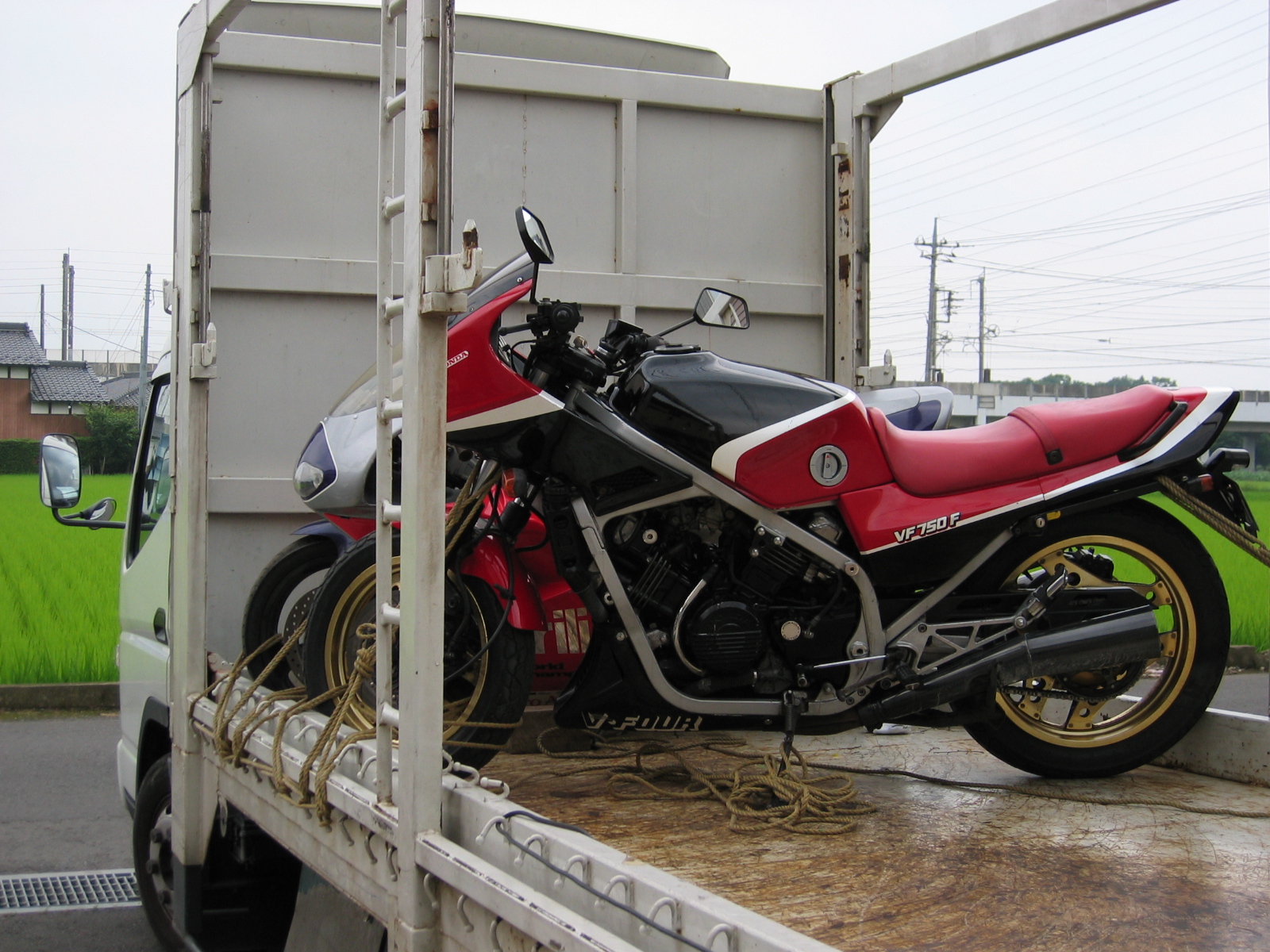 VF750F:1号 新天地へ 先週ヤフオクでご成約いただいたVF1号機が、先ほど陸送業者のトラックに載せられて、新天地へと旅立ちました。短い付き合いだったけど、いろんな思い出が走馬灯のように…トラックが見えなくなるまで見送りました。次なる主は9月で18歳になる男の子。『... 2006.07.02 kojiro_tk VF750F:1号
